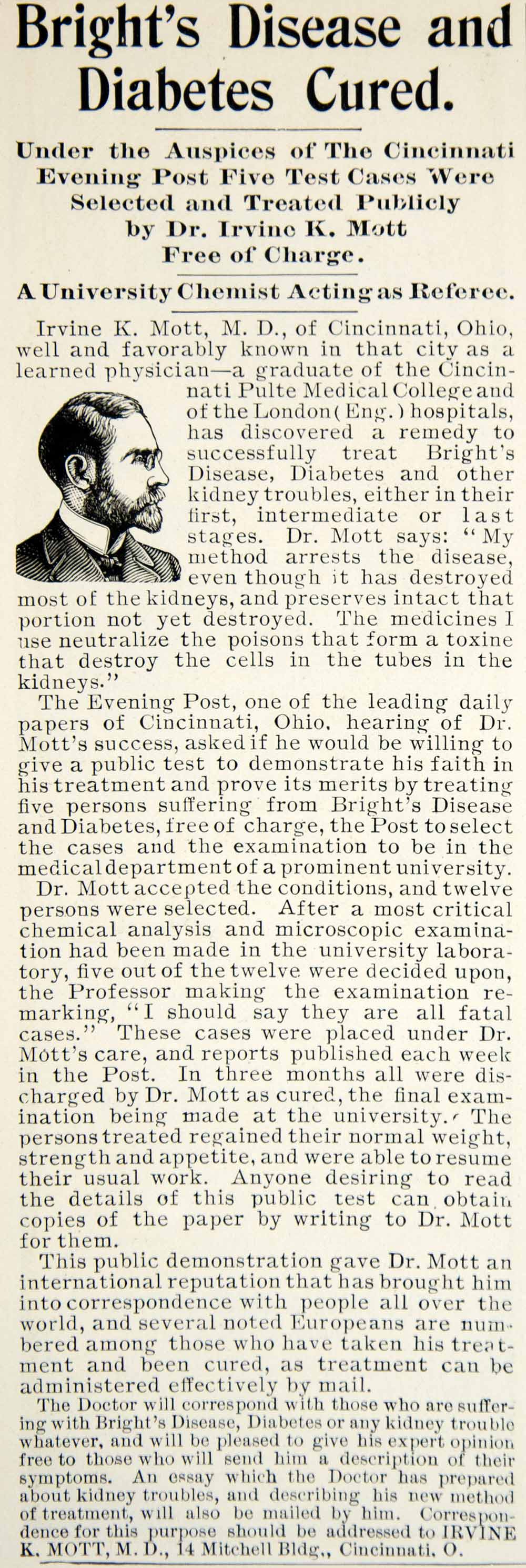 1903 Ad Medical Quackery Cure Diabetes Brights Disease Kidney Irvine K Mott YSM2