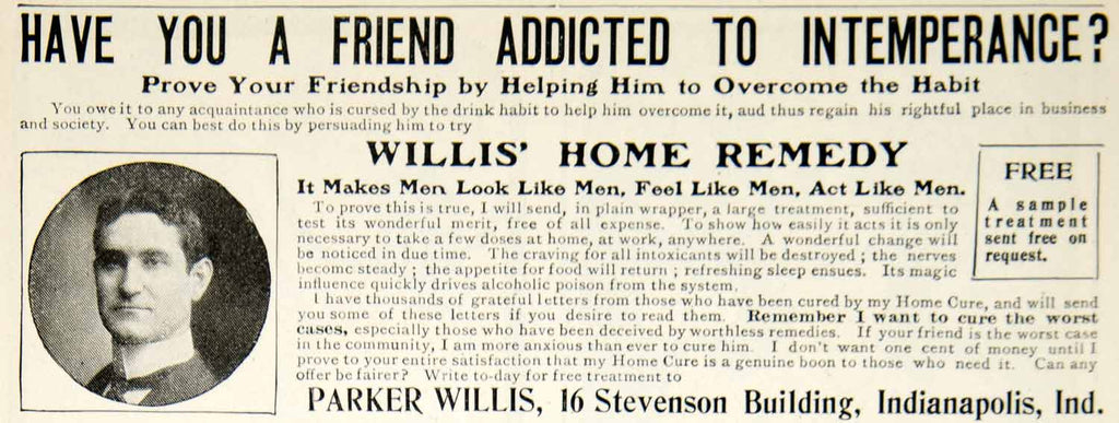 1903 Ad Vintage Parker Willis Home Remedy Alcohol Addiction Quackery Cure YSM2