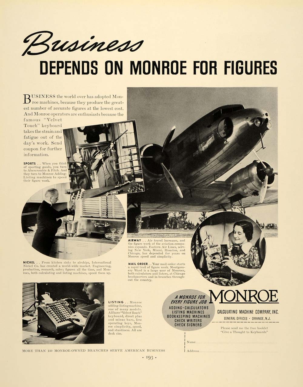 1937 Ad Aviation Airplanes Monroe Calculator Secretary - ORIGINAL FTT9