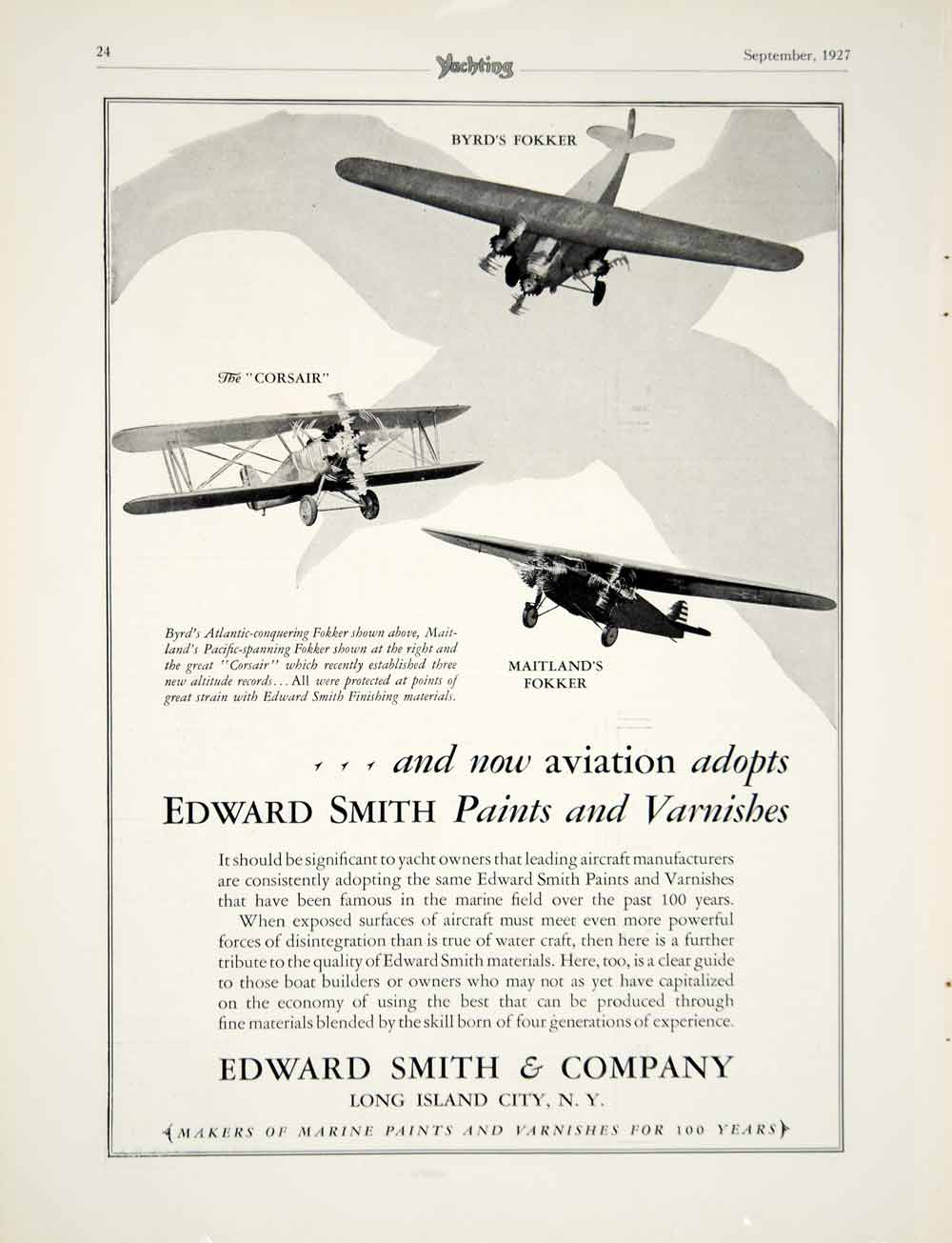 1927 Ad Edward Smith Aviation Boat Marine Paint Varnish Fokker Airplane YYM1
