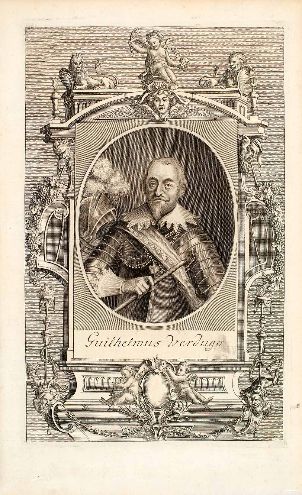 This is an original 1722 black and white copper engraving of "Guilhelmus Verdugo," also known as Guilielmus Verdugo, a member of the Council of War in the Holy Roman Empire and an Imperial military commander. In his right hand is a military baton, indicating his high military rank. The portrait is surrounded by a wonderful decorative motif mimicking a frame against a wonderfully etched background. It features two lions flanking a cherub at the top of the print and a cascading grape vine design framing the remainder of the portrait, uniting at the bottom of the print at an ornate, broach-like oval frame by two additional cherubs.