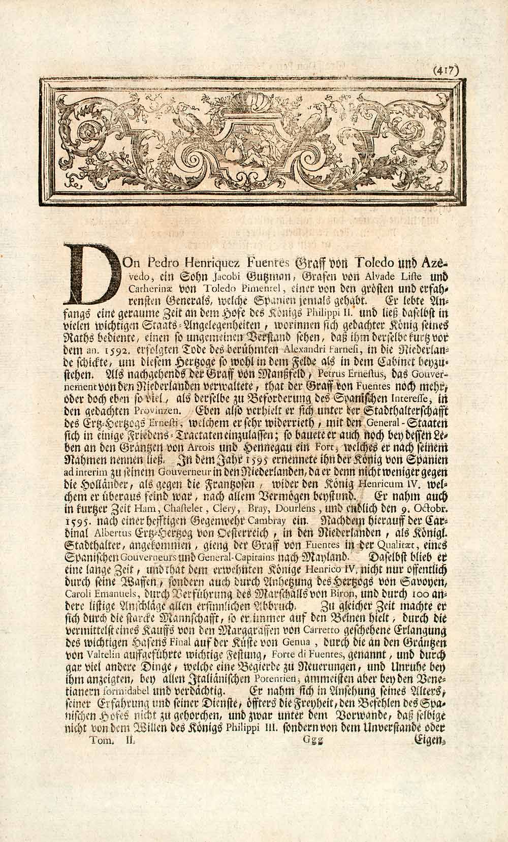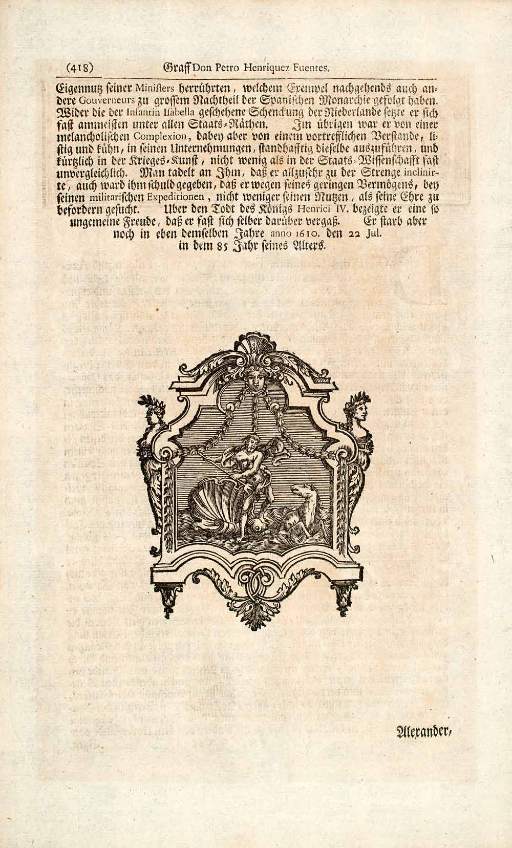 Period Paper is pleased to offer an extremely rare and impressive early eighteenth century collection of biographies and portrait engravings and etchings, produced in Leipzig, Germany in 1721 and 1722. Included are notable monarchs, rulers, religious figures, and members of notable Houses throughout Europe, including several genealogical charts of dynastic lines, spanning the sixteenth to early eighteenth centuries. The collection is comprised of exquisitely engraved and etched copper portrait plates framed by varying decorative motifs, all engraved by Johann Friedrich Rosbach. Many of the portraits include separate biographical pieces ranging in length from a single paragraph to several pages for more notable European monarchs and emperors. If present, the accompanying text is in German and is composed of beautiful woodcut text, with most pages containing elegantly etched drop cap initials, head-and tail-pieces and vignettes. The superb, folio-sized stock upon which the collection is engraved and etched employed the latest advances in eighteenth century paper making and highlights the era's predilection for strong, lightly sized paper with a fine structure and smooth surface. The paper's characteristics are thus similar to Japanese Gampi, and the result is well-preserved and crisp images that exceptionally capture Rosbach's fluid and sharp line work. This collection represents a unique opportunity to collect a valuable part of European history stunningly composed and illustrated.