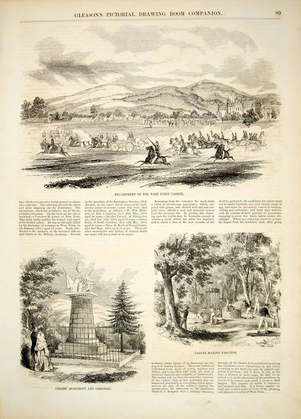 This is an original 1852 two-page print article, illustrated with black and white in-text wood engravings, about the United States Military Academy at West Point, New York. The engravings include the West Point Hotel and road from the landing; Kosciuszko's Monument; an encampment of West Point cadets; the Cadet's Monument and Cemetery; and cadets making fascines. Please see both images.