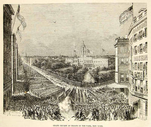 This is an original 1852 black and white in-text wood engraving of a grand review of troops at Broadway Park in the city of New York, NY.