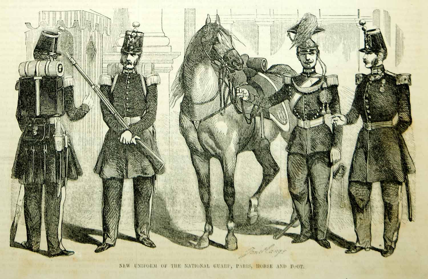 This is an original 1854 black and white in-text wood engraving of the uniform of the French National Guard.