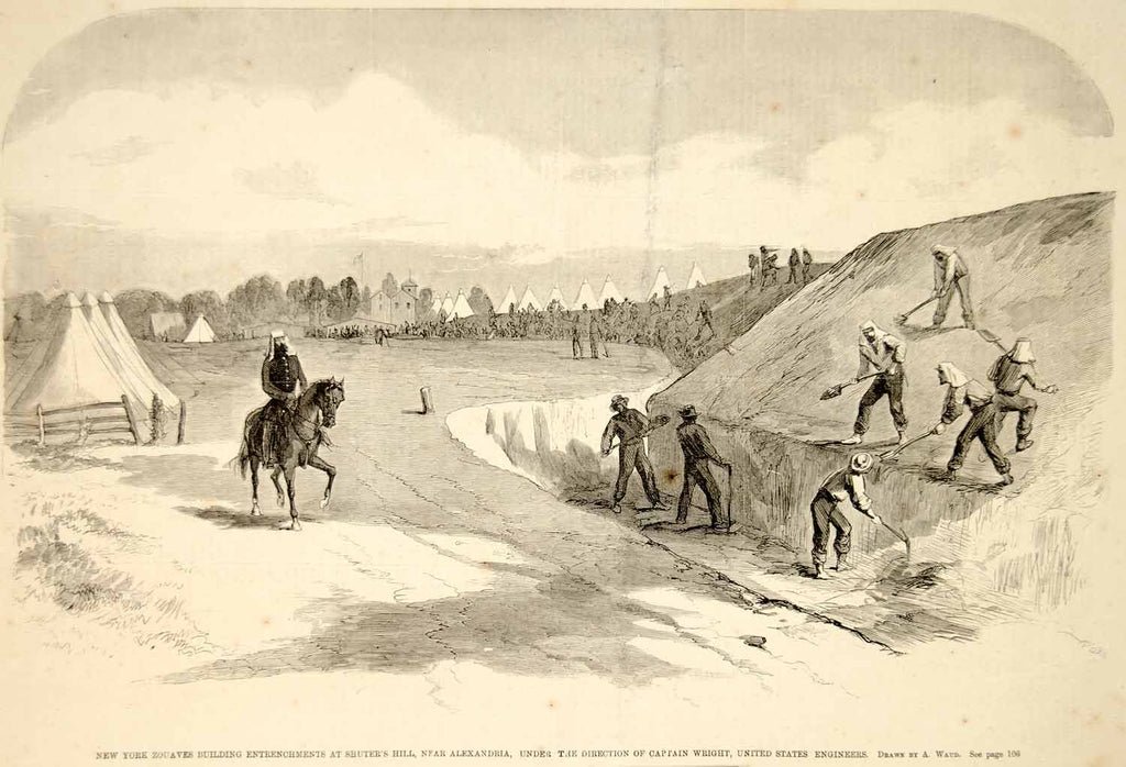 1861 Wood Engraving Shuter's Hill Entrenchments NY Zouaves U.S. Civil War NYN1