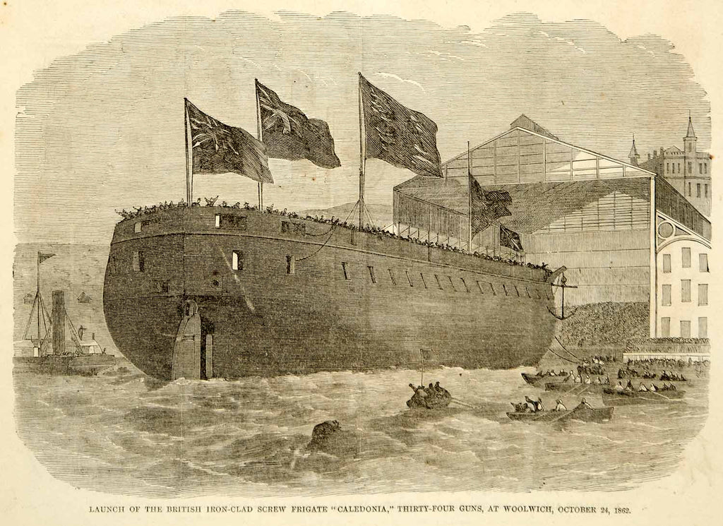 1862 Wood Engraving HMS Caledonia Ironclad Frigate Woolwich Dockyard YHW2
