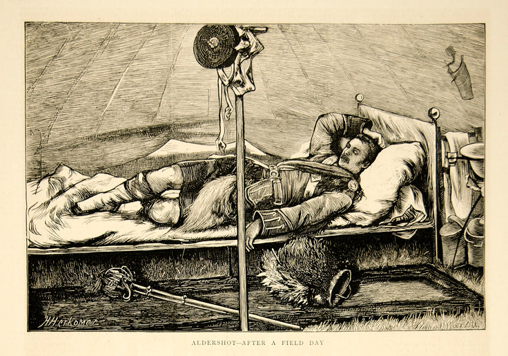 1870 Wood Engraving Aldershot Highland Soldier Resting Test Nap Military YTG1