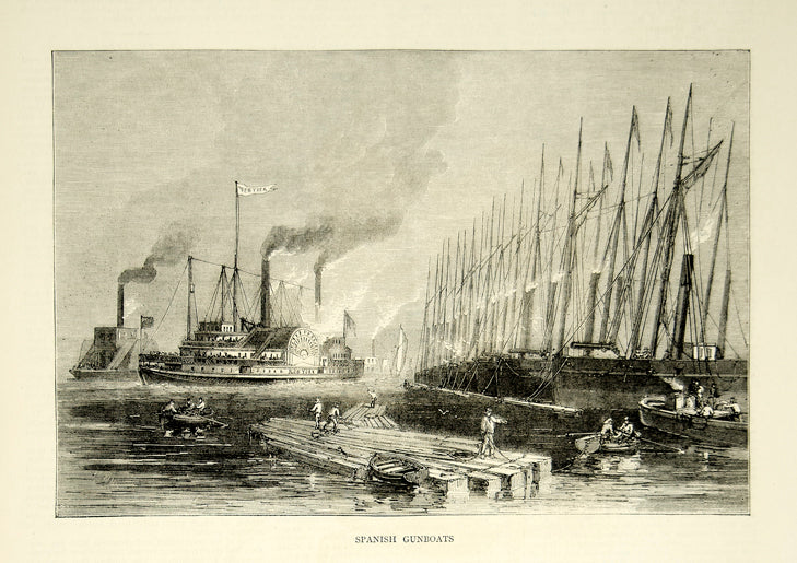 1870 Wood Engraving Art Spanish Gunboats Cuba Caribbean Sea Navy Military YTG1