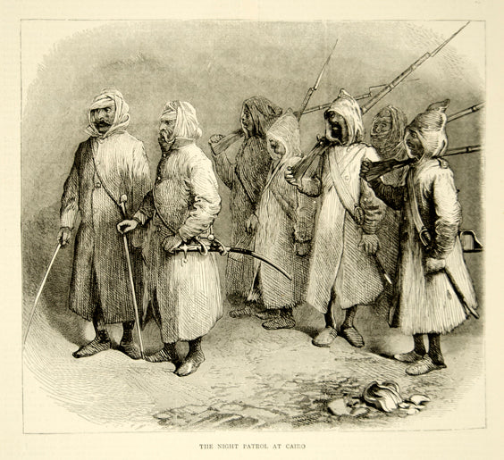 1870 Wood Engraving Art Night Patrol Cairo Egypt Africa Soldiers Military YTG1