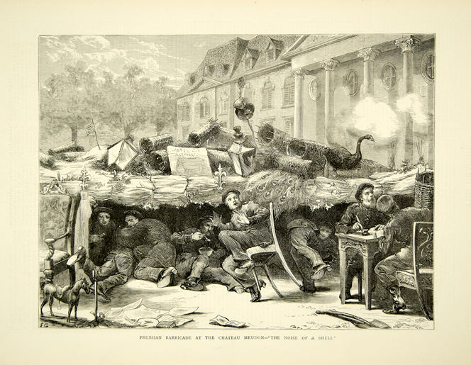 1870 Wood Engraving Franco-Prussian War Barricade Chateau Meudon France YTG1
