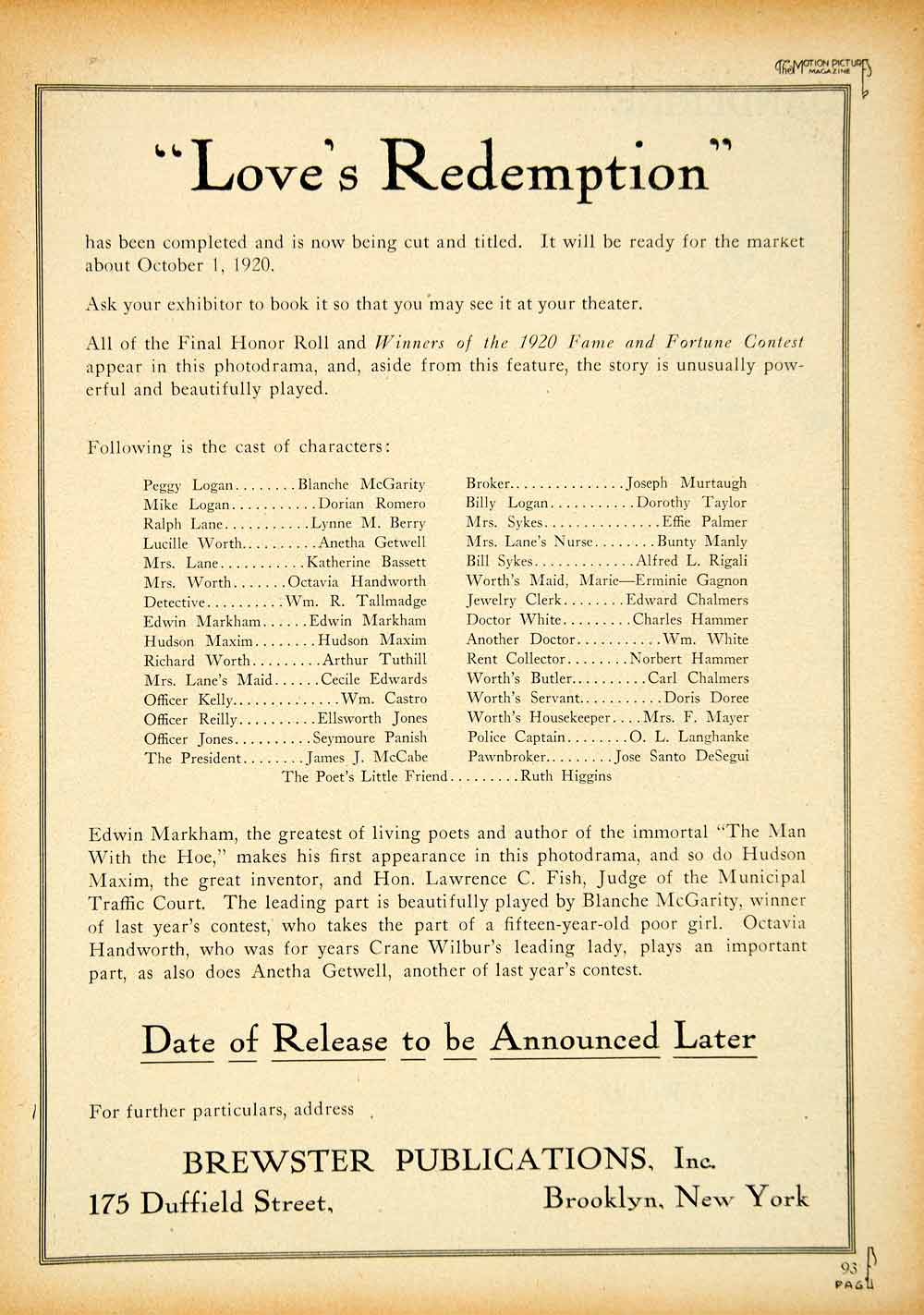 1921 Ad Love's Redemption Brewster Publications 175 Duffield Street Effie YMP1