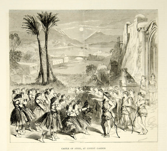 1870 Wood Engraving Castle Steel Covent Garden Pantomime Theater London YTG1