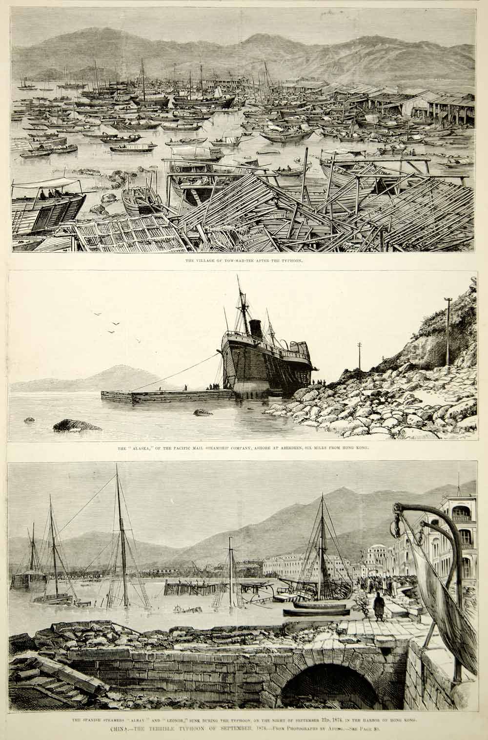 1875 Wood Engraving 1874 Hong Kong Typhoon Disaster Damage Ship Lai Afong China