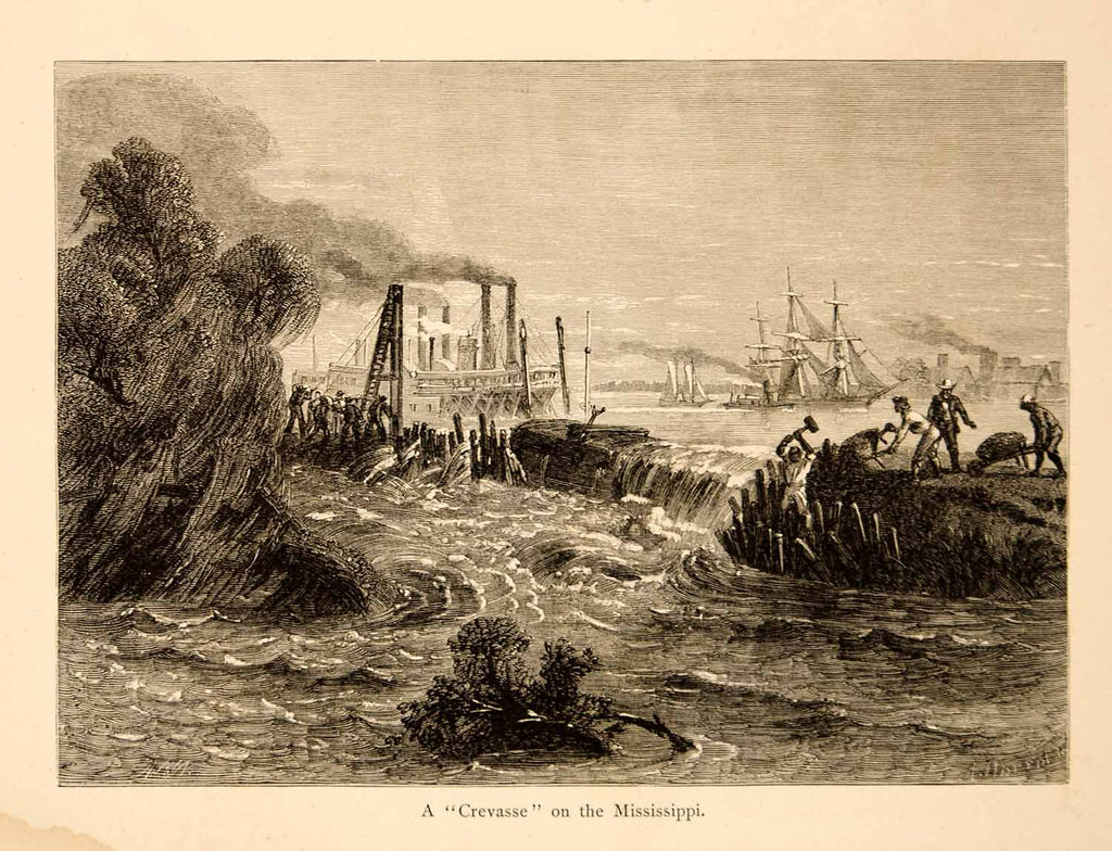 1872 Wood Engraving Mississippi River Breached Levee Cravasse Alfred R Waud YPA1
