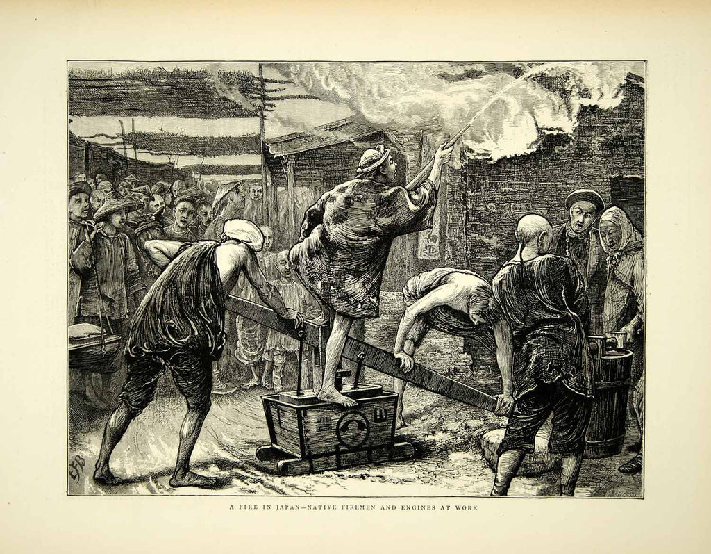 1872 Wood Engraving Edward F Brewtnall Art Firefighters Engine Japan Asia YTG4