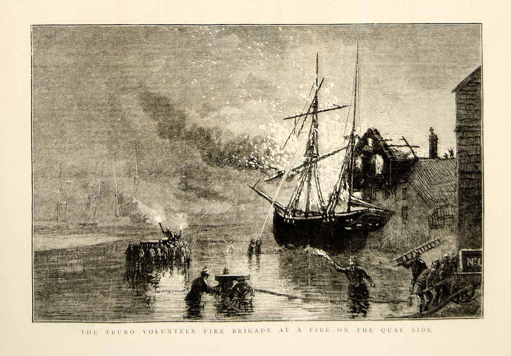 1873 Wood Engraving RH Carter Art Firefighter Brigade Truro England Ship YTG5