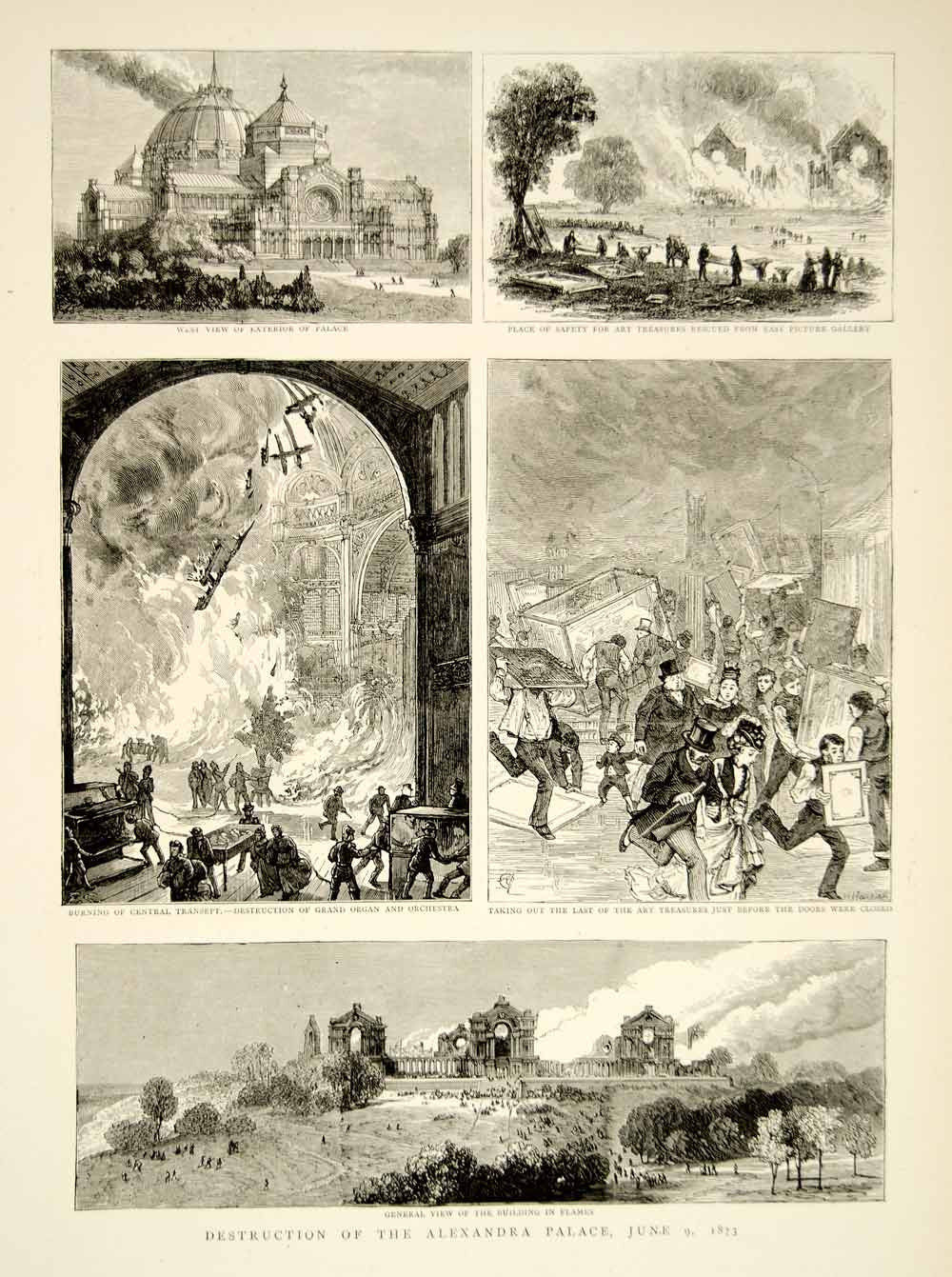 1873 Wood Engraving Art Alexandra Peoples Palace Fire London UK Victorian YTG6