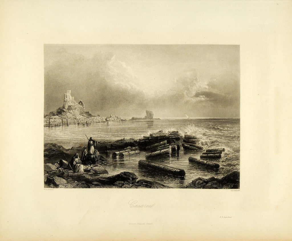 1849 Copper Engraving Caesarea Israel Architecture Ruins Boat Mediterranean XHA2