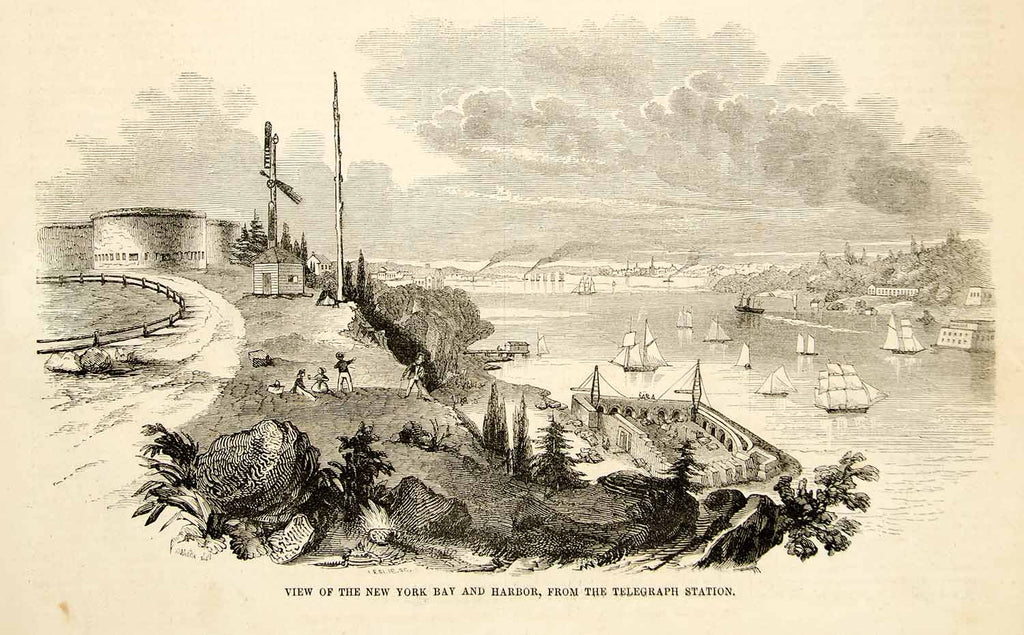 1852 Wood Engraving New York City Bay Harbor Telegraph Station Historic YGP2
