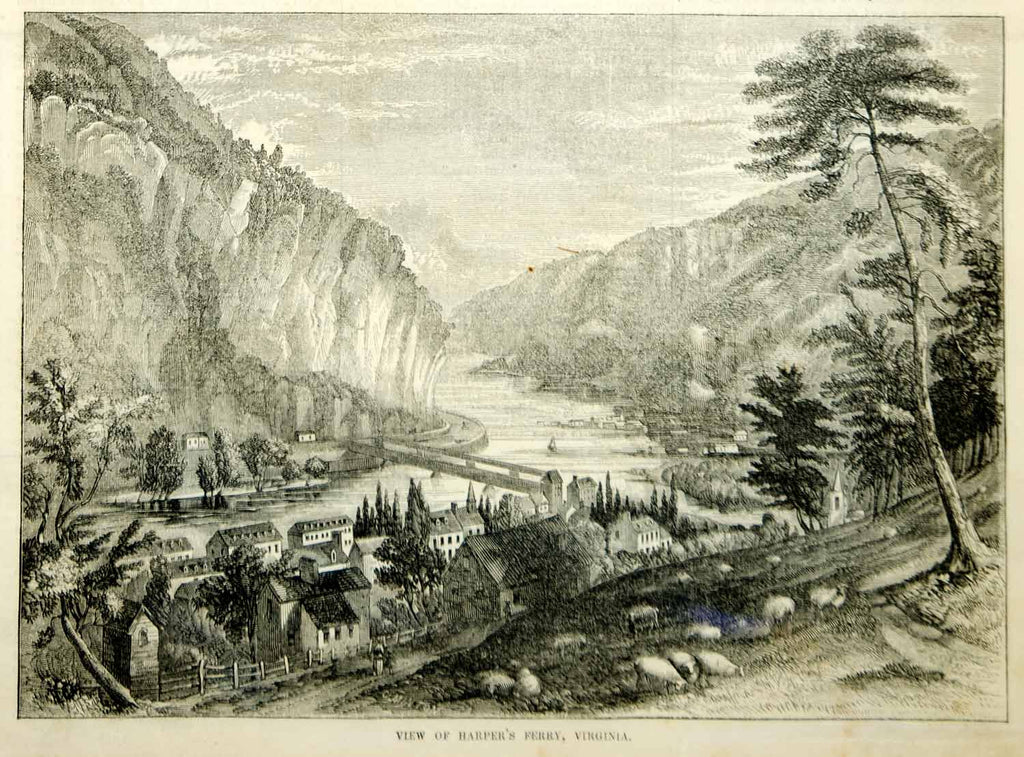 1854 Wood Engraving Harpers Ferry West Virginia Cityscape Historic Antique View