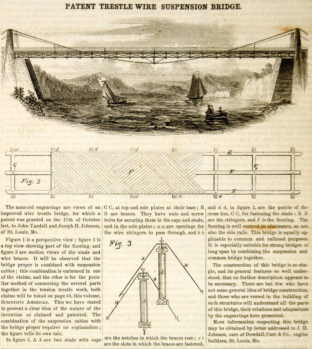 1854 Wood Engraving Wire Trestle Suspension Bridge Engineering Invention YSA2