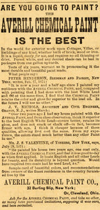 This is a small original 1871 black and white print ad for Averill Chemical Paint by Averill Chemical Paint Company, located at 32 Burling Slip, New York and Cleveland, Ohio. This ad has testimonies from Peter Henderson a seedsman and florist in New York, J. V. Nichols an architect and civil engineer in Orange, New Jersey and J. S. Valtentine of Yonkers, New York.