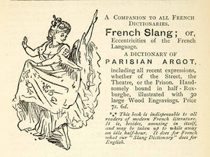 This is an original 1872 black and white print ad for A Companion to all French Dictionaries: French Slang; or, Eccentricities of the French Language.