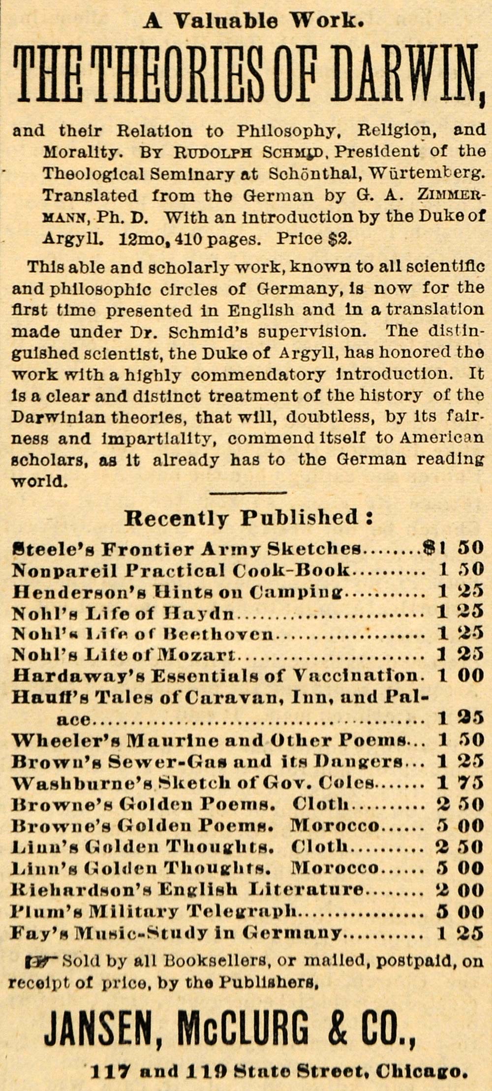 Keywords specific to this image: Antique Advertising, Philosophy, Religion, Books, Morality, Rudolph Schmid, Theology, Theological Seminary, Schonthal Wurtemberg, G. A. Zimmerman, Duke of Argyll, Pricing