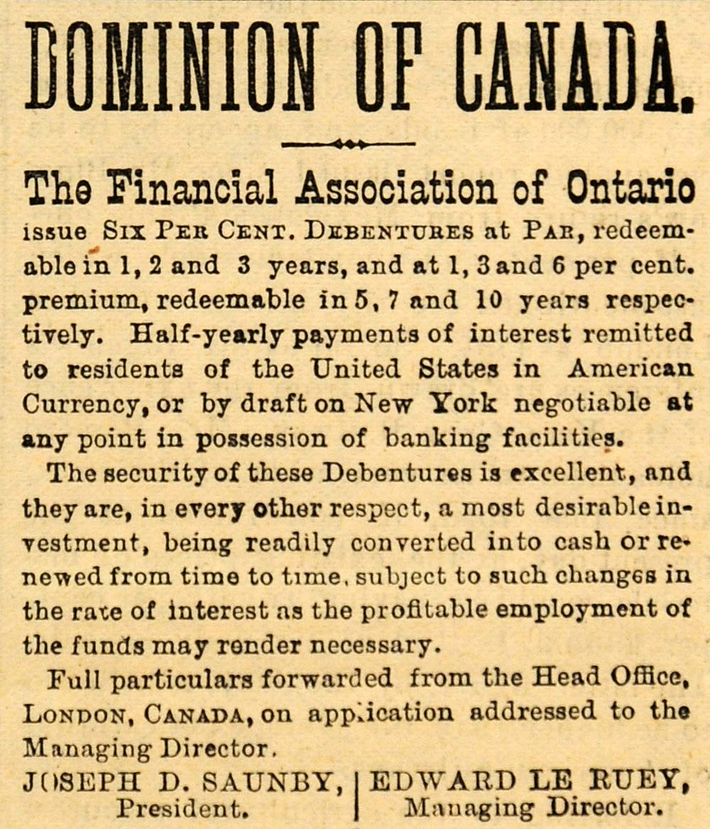 This is a small original 1882 black and white print ad for The Financial Association of Ontario.