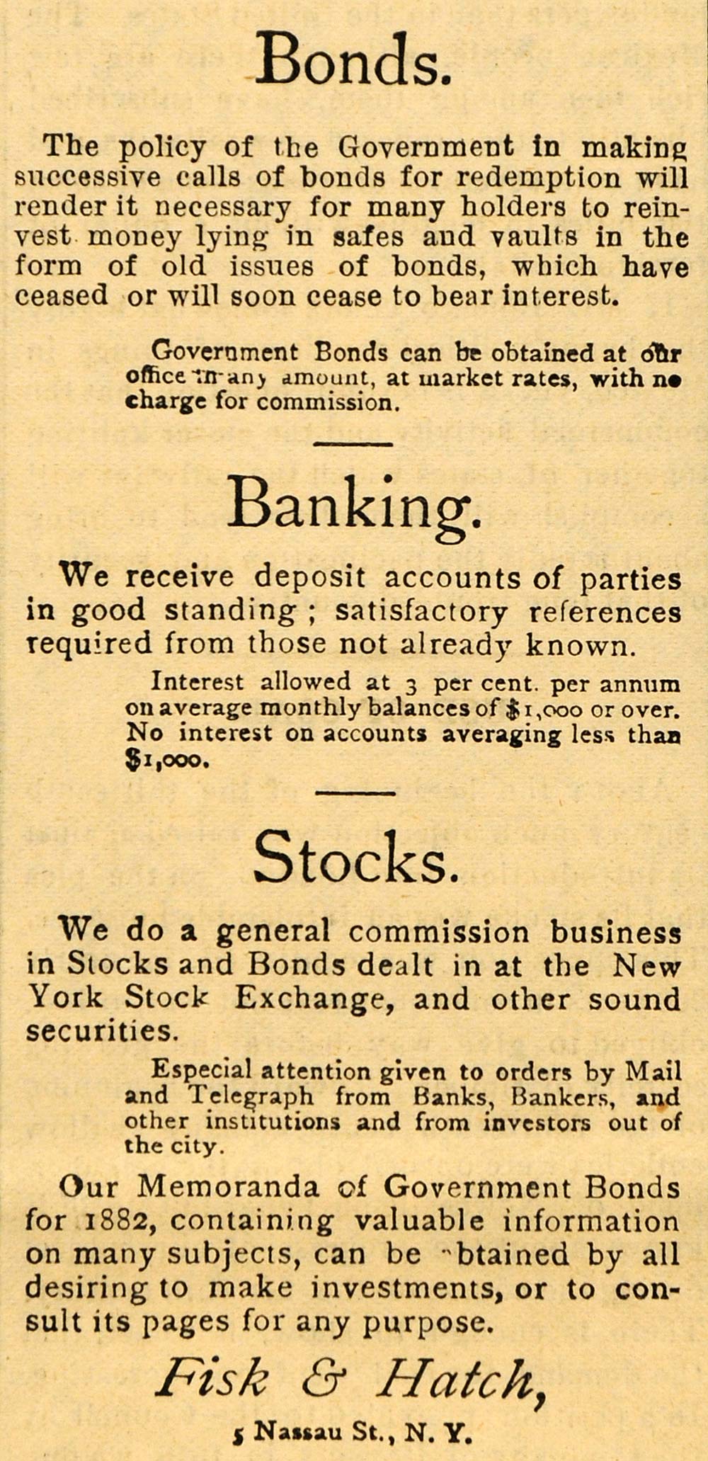 Keywords specific to this image: Antique Advertising, Investing, Investment, Bank, New York Stock Exchange, Bankers, Interest, Government Bonds, Telegraph, Securities