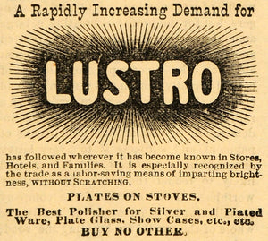 This is a small original 1882 black and white print ad for Lustro, a polish for silver, plated ware, plate glass, show cases and more.