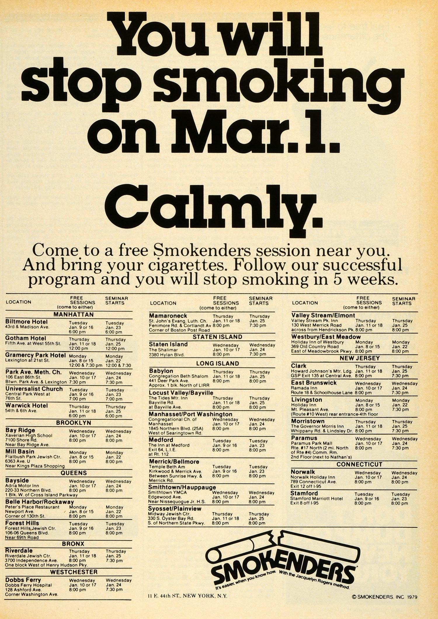 This is an original 1979 black and white print ad for the Smokenders, a five week quit-smoking program from Smokenders Incorporation located at 11 East 44th Street, New York City.