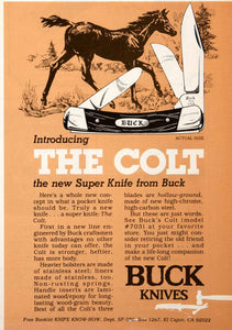 This is an original 1980 two-color print ad for "The Colt," made by Buck Knives Company.