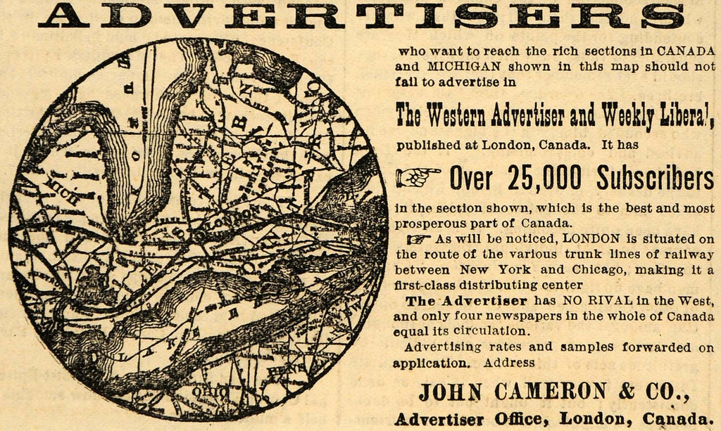 1882 Ad John Cameron Western Advertiser Weekly LIberal - ORIGINAL TIN6