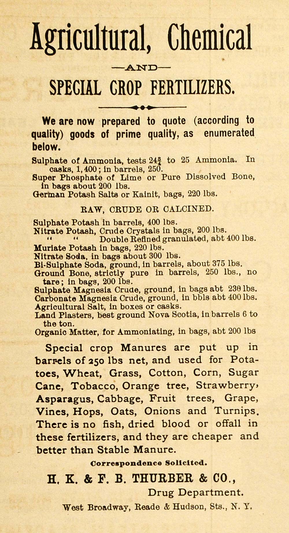 1883 Ad Agriculture Chemical Crop Fertilizer Thurber - ORIGINAL GROC1