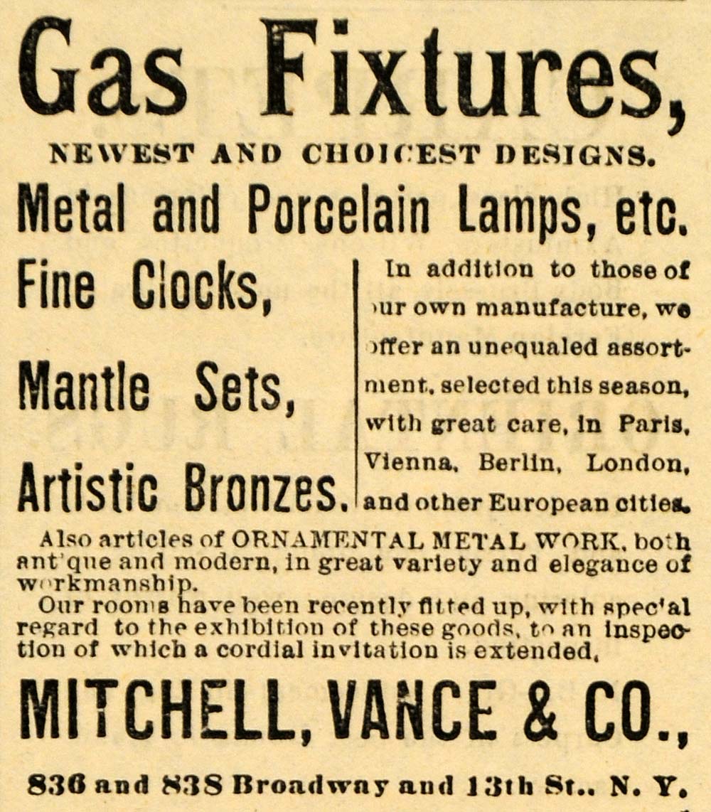 1882 Ad Mitchell Vance Gas Fixtures Home Decorations - ORIGINAL ADVERTISING TIN6