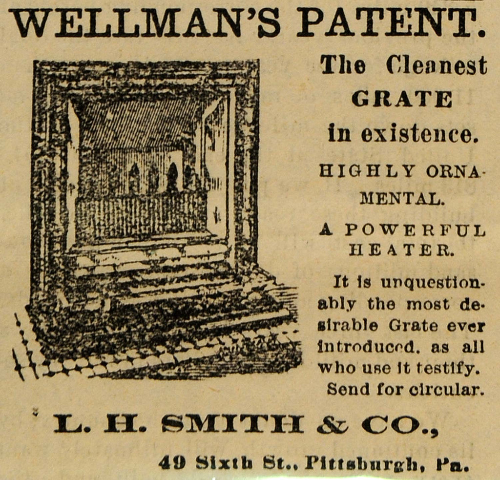 1882 Ad Wellman's Patent Grate Fireplace L. H. Smith - ORIGINAL ADVERTISING TIN6