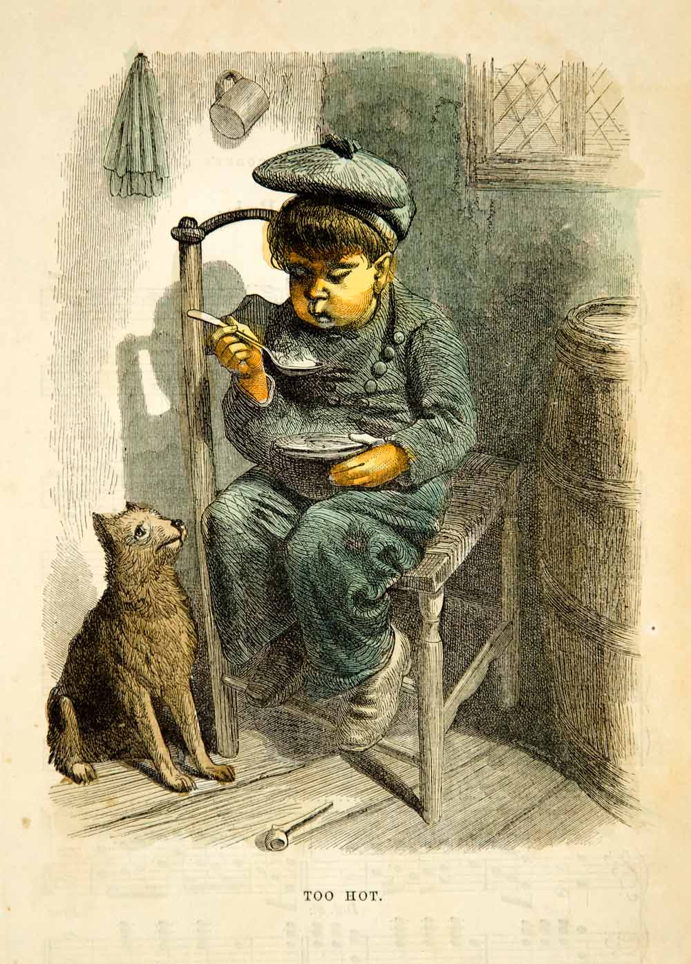 1862 Wood Engraving Victorian Child Boy Blowing Hot Soup Hungry Dog Hand YGLB1