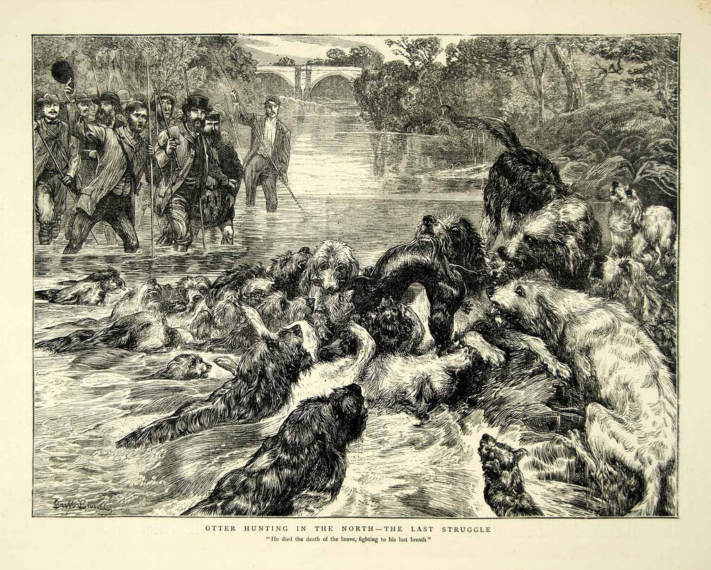 1872 Wood Engraving Basil Bradley Art Otter Hunting Dogs Hounds Sportsman YTG3