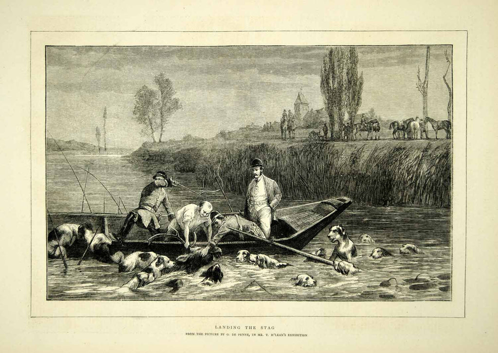 1872 Wood Engraving Charles Oliver De Penne Art Landing Stag Hunting Dogs YTG4