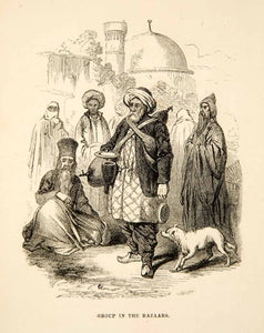 This is an original 1858 black and white wood engraving that depicts a gentleman wandering through a Middle Eastern bazaar with his dog at his heels.