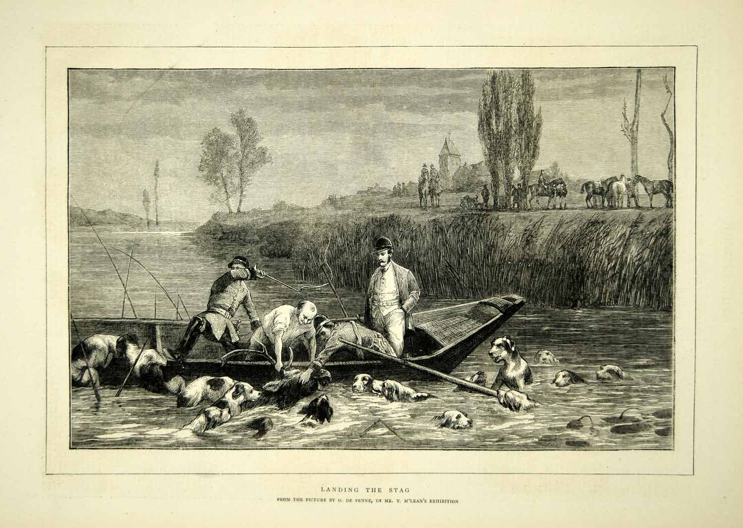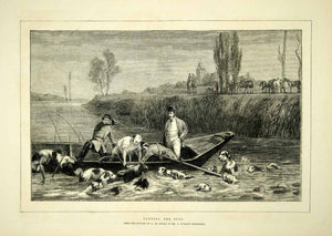 This is an original 1872 black and white in-text wood engraving of a painting by Charles Oliver De Penne entitled "Landing the Stag" that depicted a pair of hunters lifting a dead deer into their canoe with the help of their dogs in the English countryside during the Victorian Era.