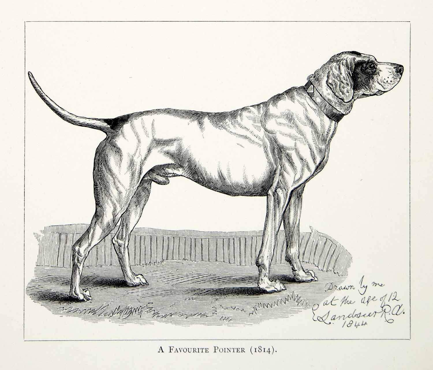 This is an original 1877 black and white wood engraving of "A Favourite Pointer, 1814."
