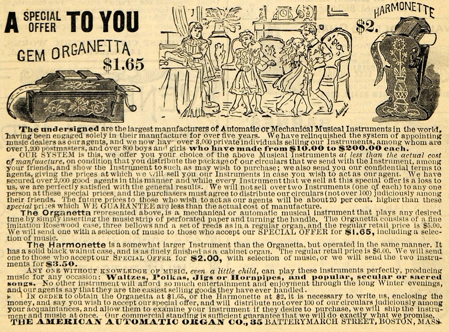 This is an original 1885 black and white print ad for the Gem Organetta and Harmonette, products by The American Automatic Organ Company, located at 35 Battery March Street in Boston, Massachusetts.
