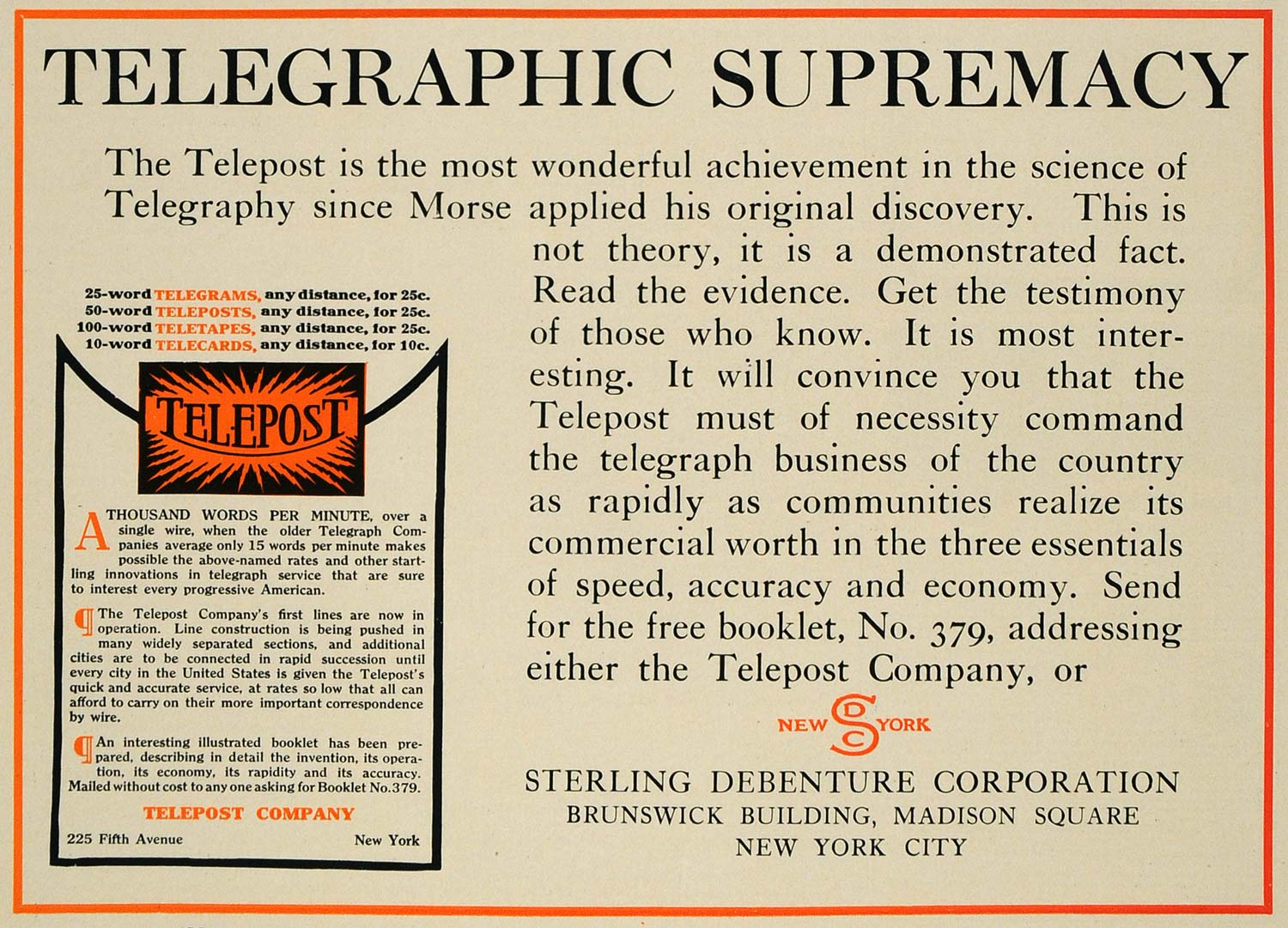 Keywords specific to this image: Vintage Advertising, Telegraphy, 225 Fifth Avenue New York, Pricing