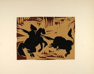 This is an original 1962 lithograph of the original linocut by Pablo Picasso, created with one block: ocher, brown, black. This original lithograph is from the rare numbered collection, registered as 472/520. This number will recorded on the certificate accompanying the lithograph. Numeric registration in 1962 was 885 and legal registration was 29.632. First edition production. Copyrighted and registered in 1962 and released in February 1963.