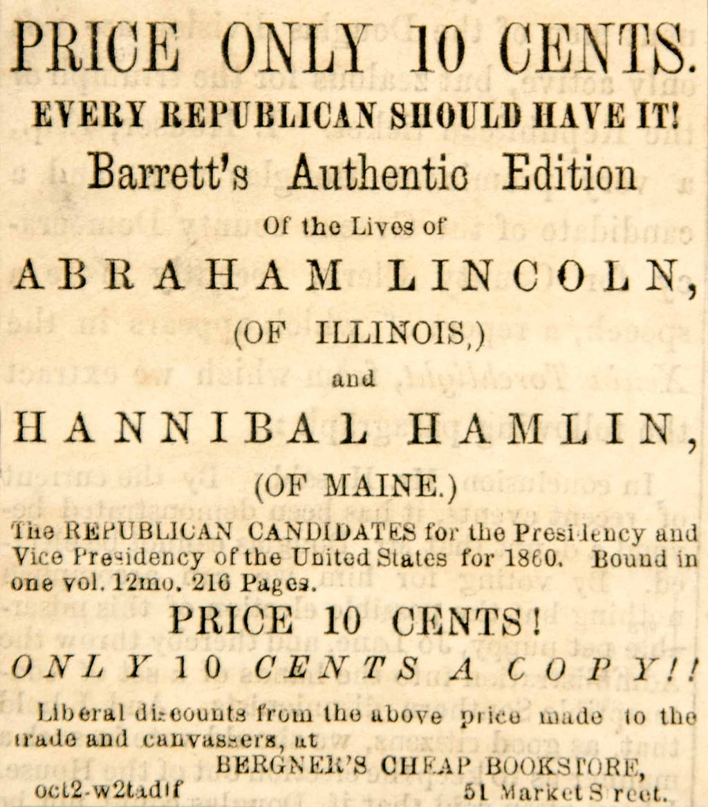 1860 Ad Book Abraham Lincoln Hannibal Hamlin J. H. Barrett Lives Biography YOA1
