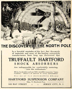 This is an original 1909 black and white print ad for Truffault Hartford shock absorbers for automobiles that were made and sold by the Hartford Suspension Company of 165 Bay Street, Jersey City, New Jersey (NJ).