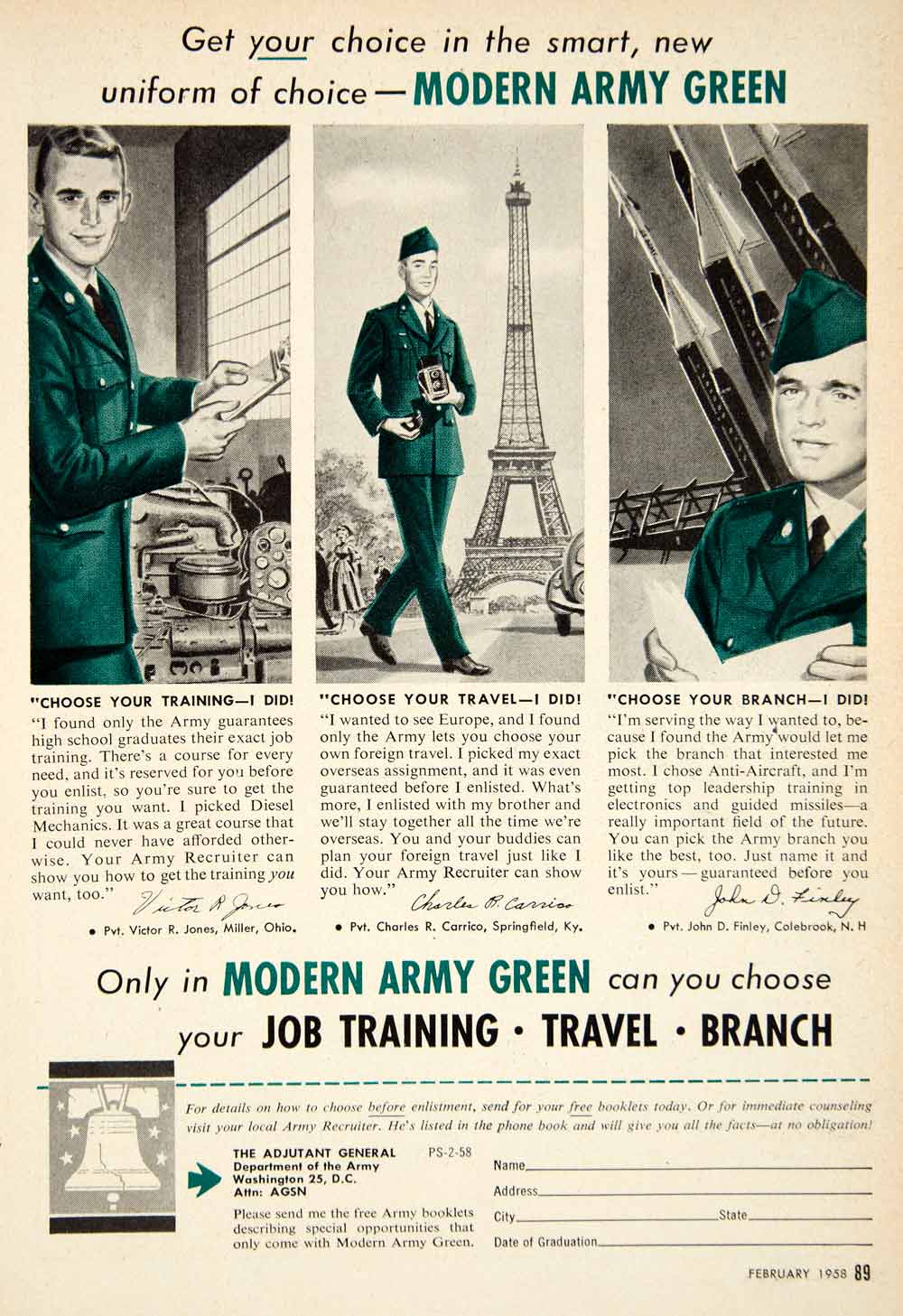 1958 Ad US Army Modern Green Military Recruitment Enlistment Victor R Jones PSC3